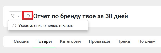 Ты можешь получать уведомление о новых товарах бренда. Для этого нажми на колокольчик рядом с любым брендом в Отчете по брендам Wildberries или Отчете по брендам Ozon.