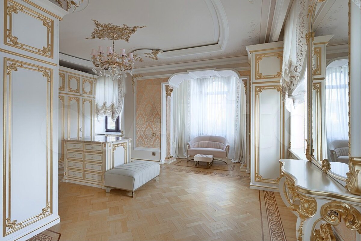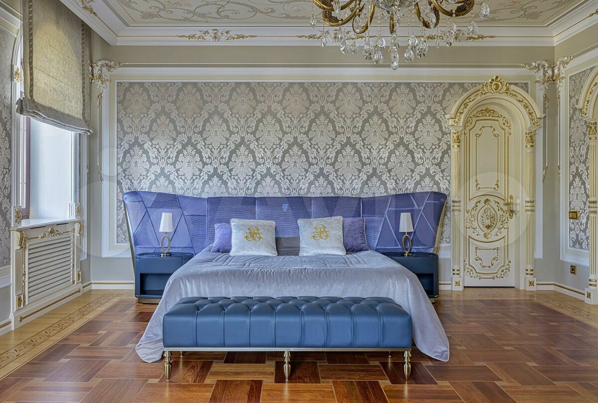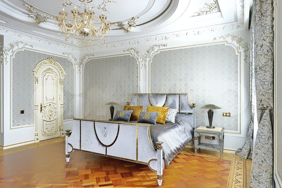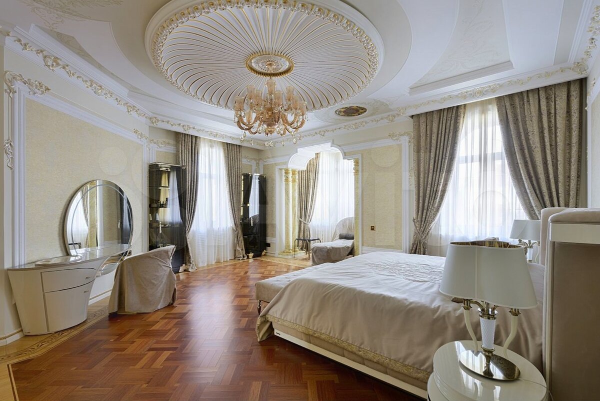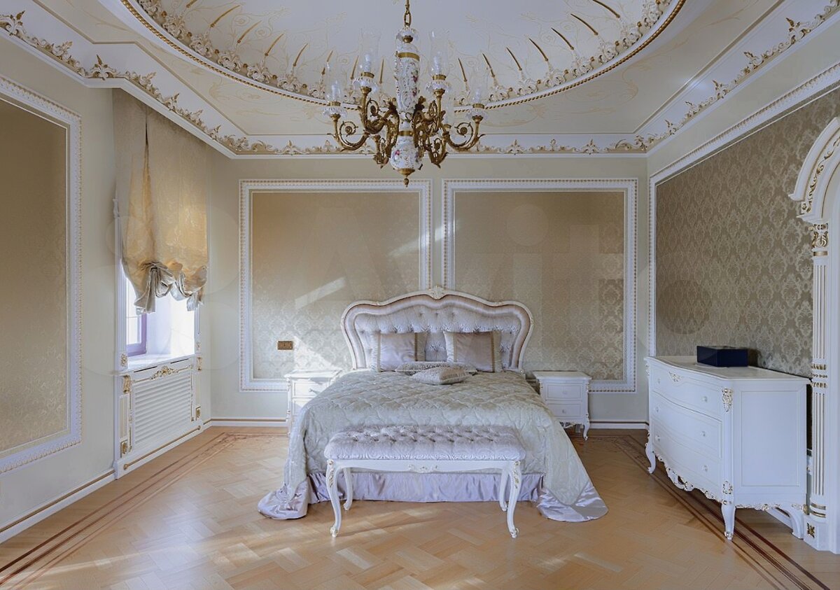 Спальни выдержаны в стилистике дома. Огромные люстры, лепнина, сусальное золото.