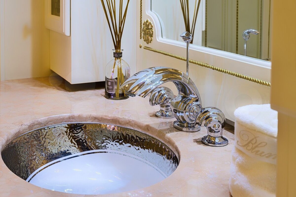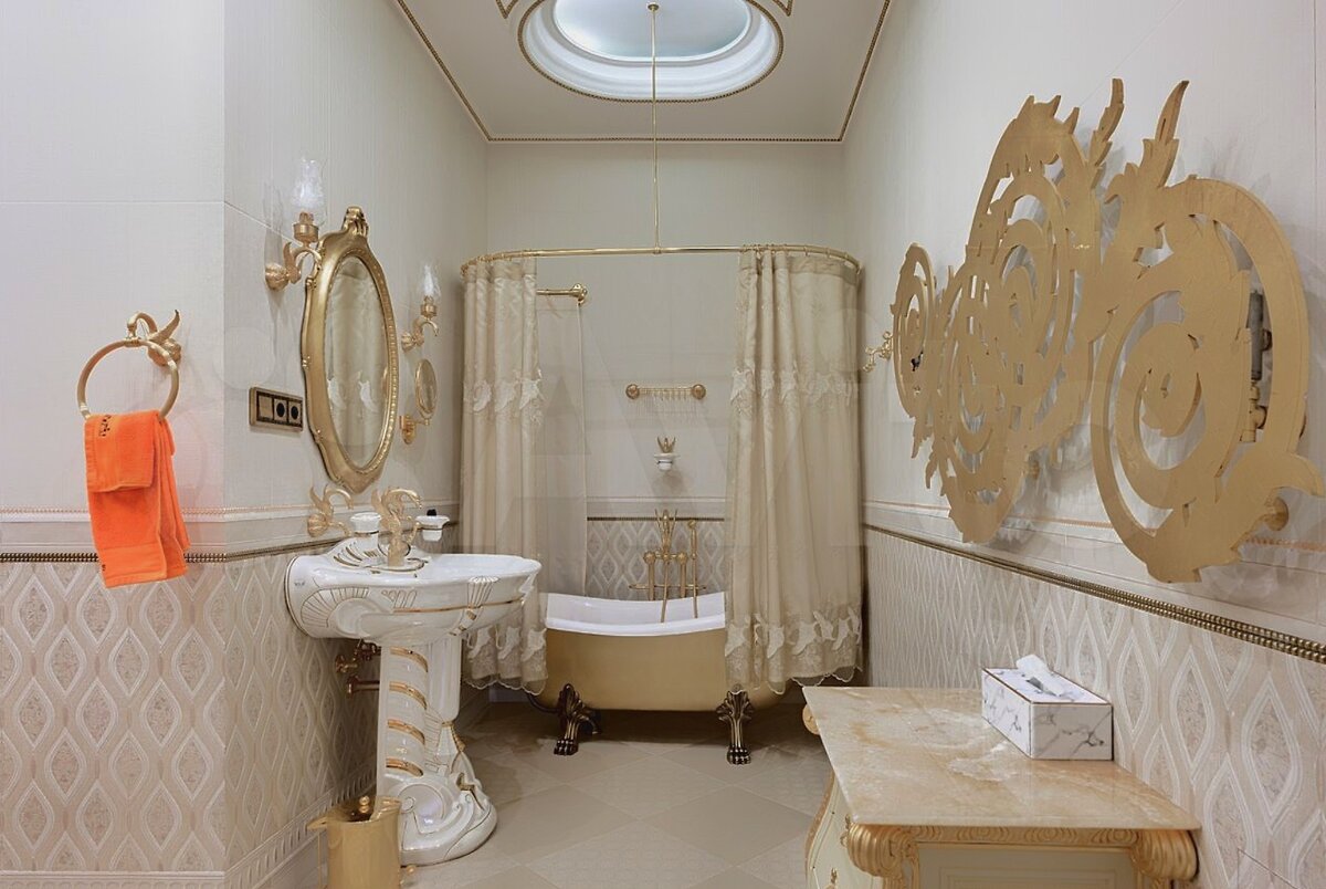 Ванные комнаты на каждую спальню. Спален тут 8. Главное же не в количестве, а в качестве и стиле. Сразу видно, что этот дом как минимум за миллиард. Все цвета подобраны друг к другу идеально, всё сочетается с сусальным золотом, ничего не раздражает глаз, и самое главное никакой пестроты, безвкусицы и цыганщины.