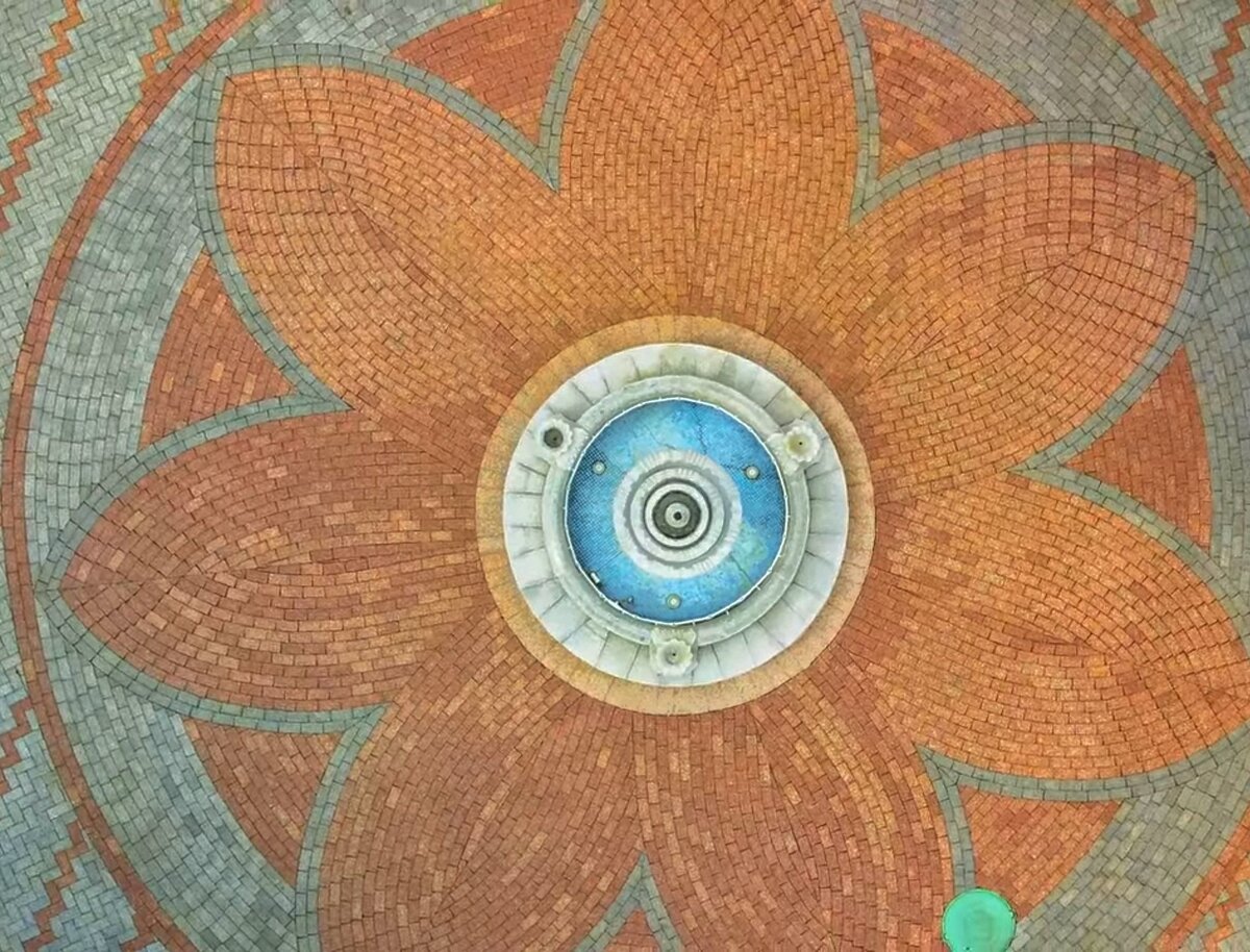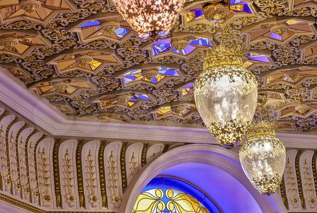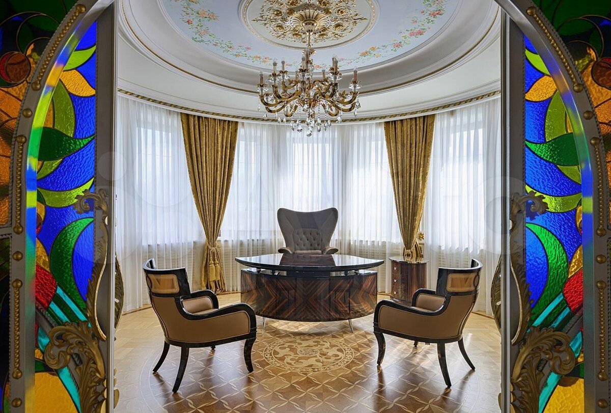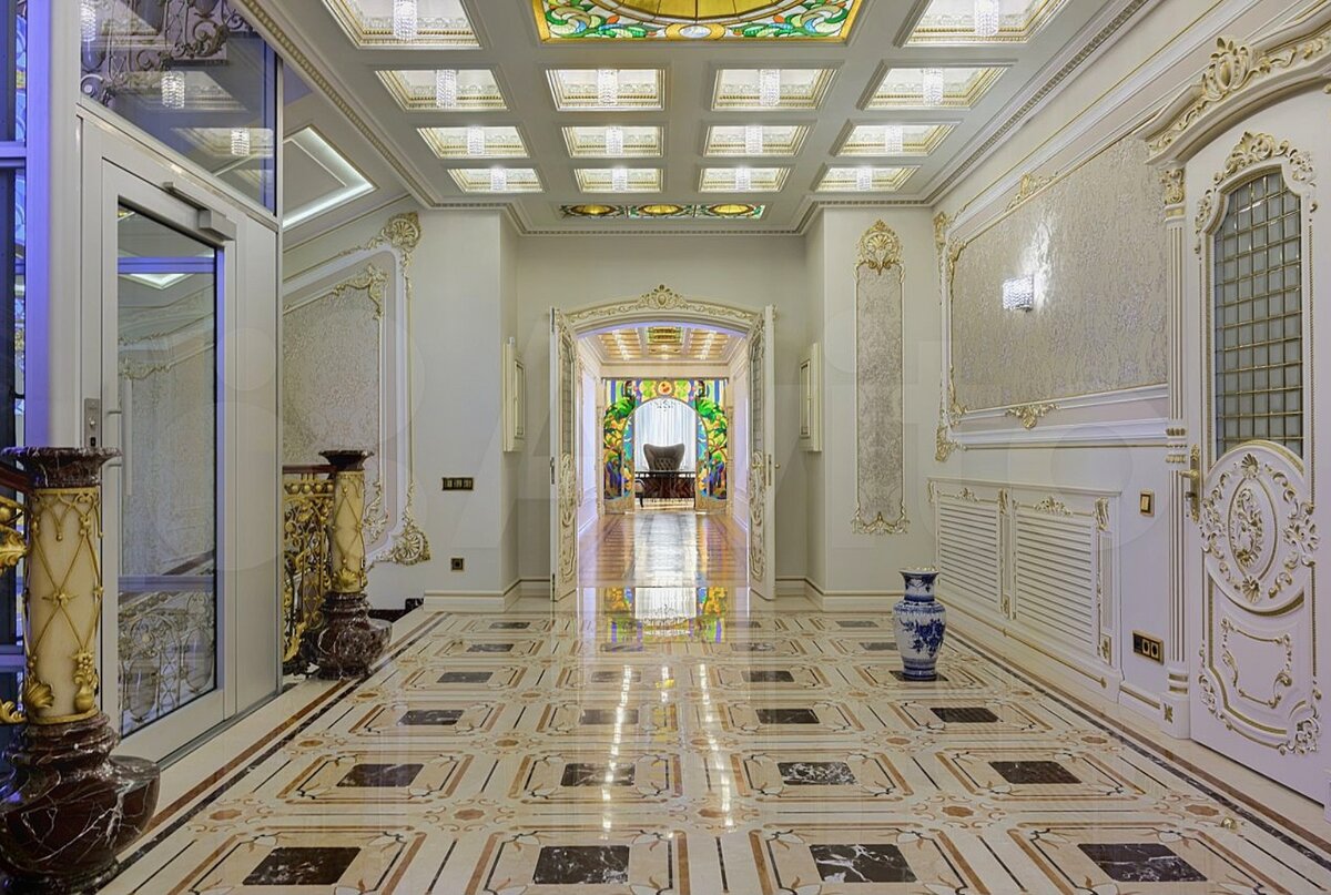 Обратите внимание на лифт с витражами и потолки из витражей и сусального золота. Вот он миллиард. Он тут.