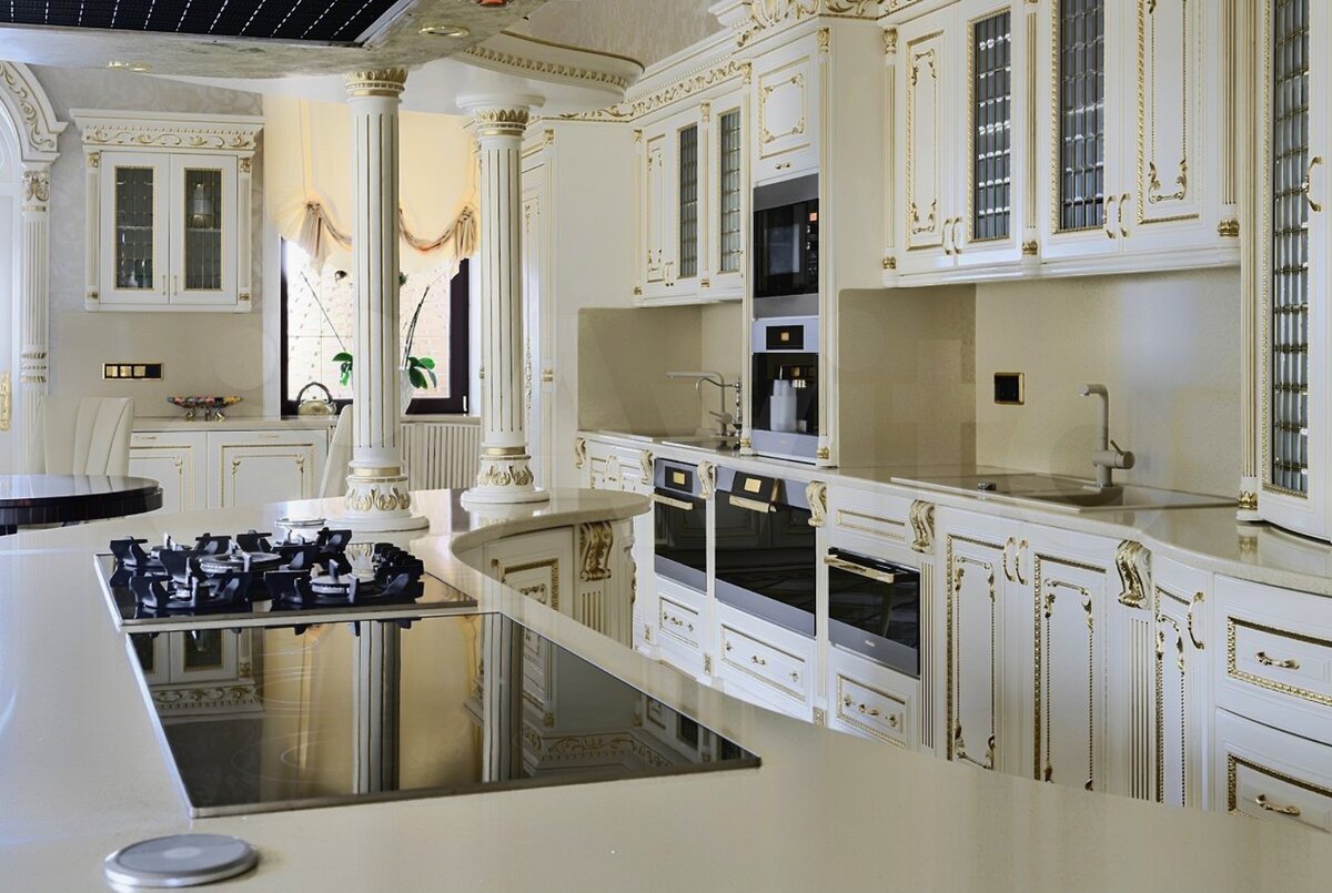 Отдельно бы хотелось отметить вытяжку островного типа, декорированную под стиль кухни сусальным золотом.