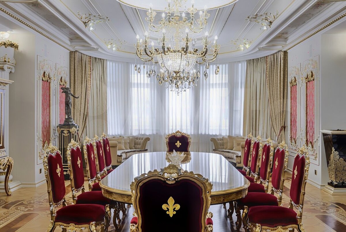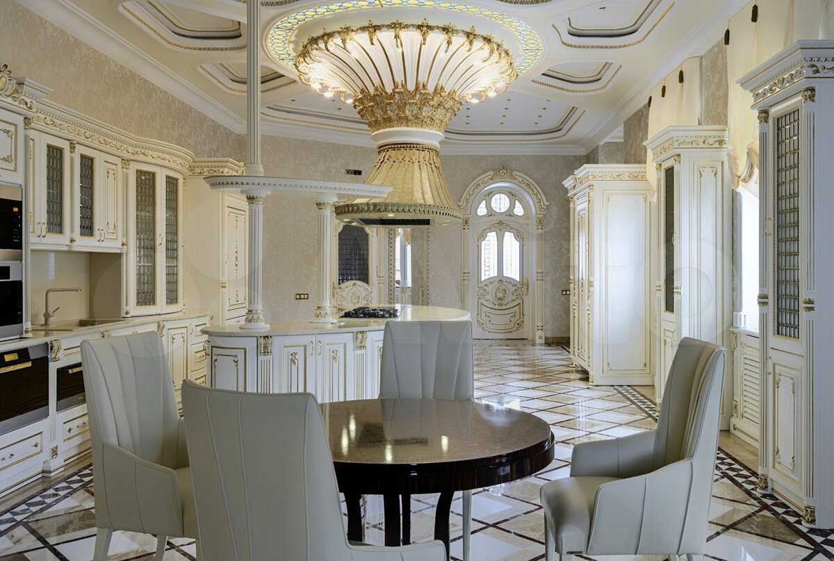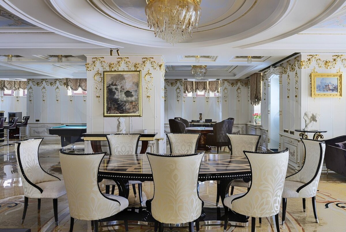В самом центре кухни расположена основная обеденная группа. Огромный гостевой зал. Тут есть полукруглый диван и огромный гостевой обеденный стол на 8 персон. В декоре использовано сусальное золото, зоны разделены люстрами.