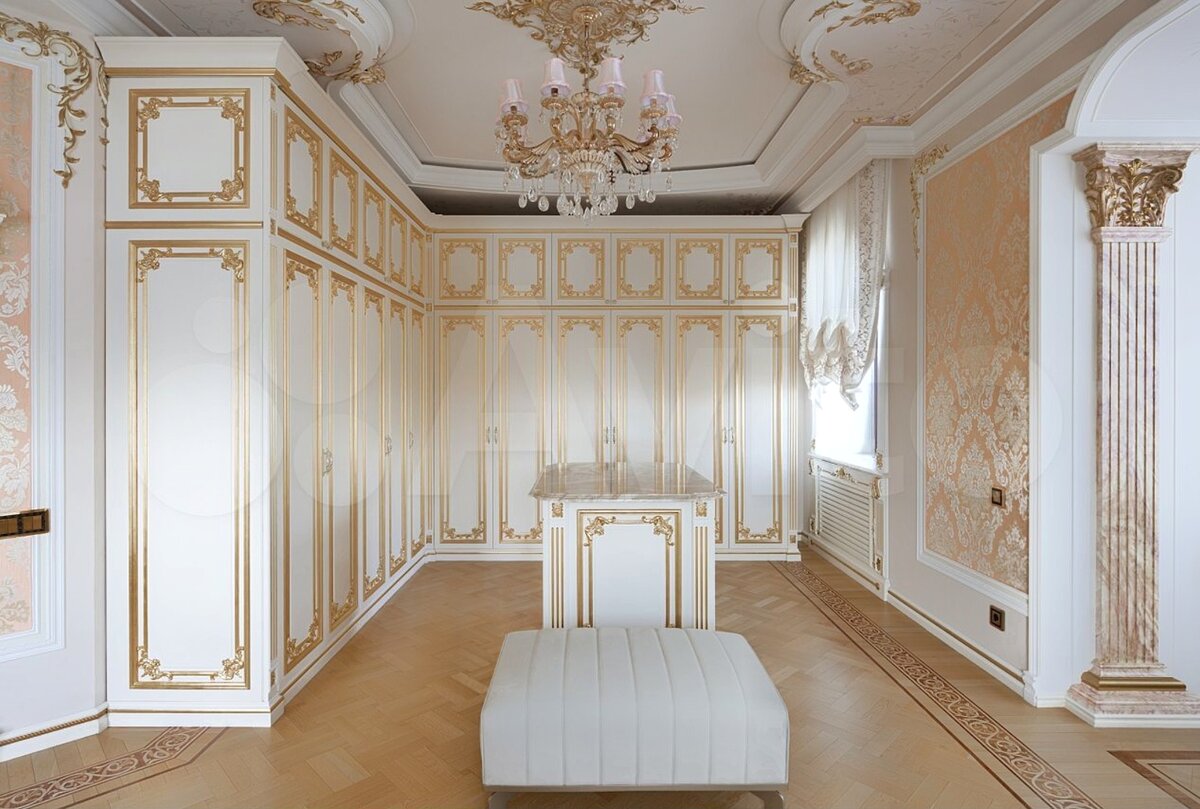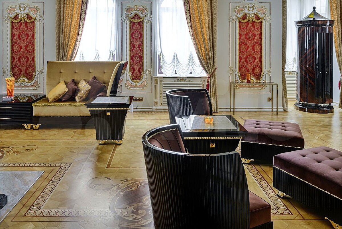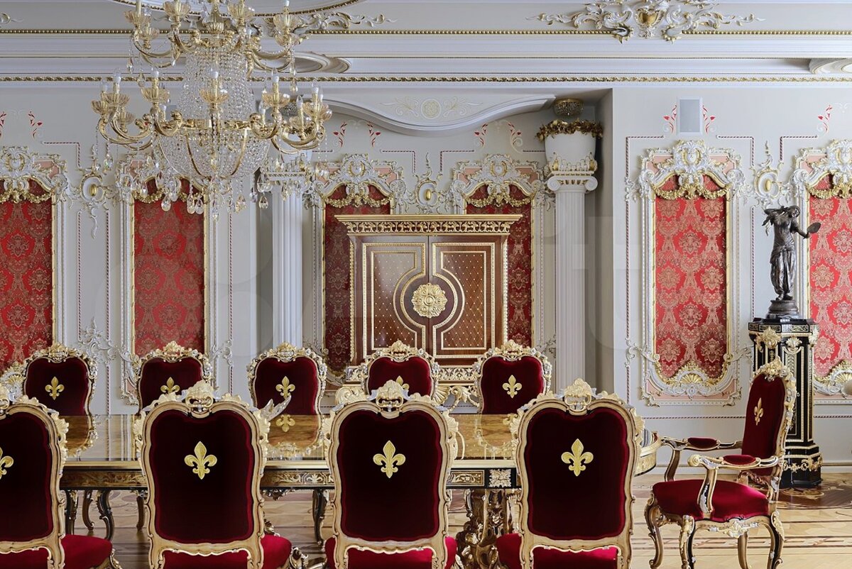 Тут расположен гостевой стол и стулья. В углу расположен угловой диван полукруглой формы. Повсюду комоды и люстры, светильники и бра, статуи и сусальное золото.