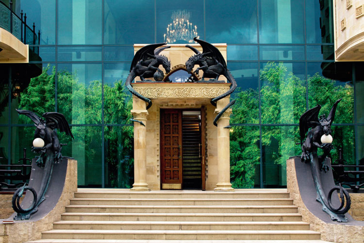 При входе в обитель расположен высокий холл. Излишняя роскошь и помпезность характеризует данное пространство с величественной и широкой центральной лестницей и огромной люстрой.