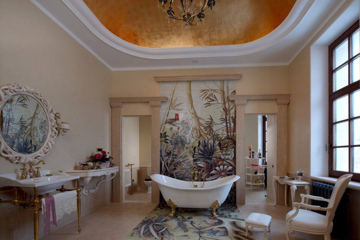Ванная комната не лишена дворцовой роскоши, изящности и богатства. В таких царственных и нескромных палатах Примадонна принимала ванну и пудрила носик. В таких будуарах могли бы жить царь с царицей в средние века исторического неравенства. Но история поменялась, пришли рабочие и крестьяне, захотевшие стать царём и царицей без лишней скромности и понтов.