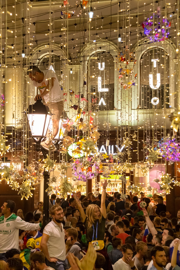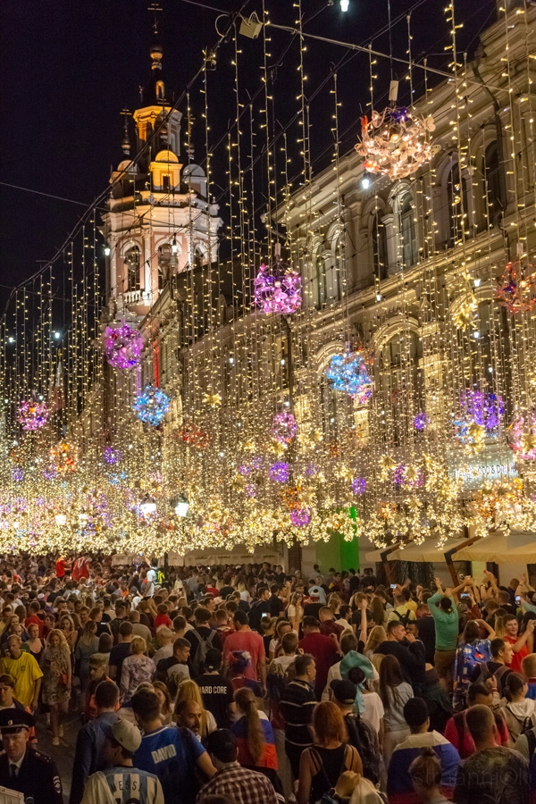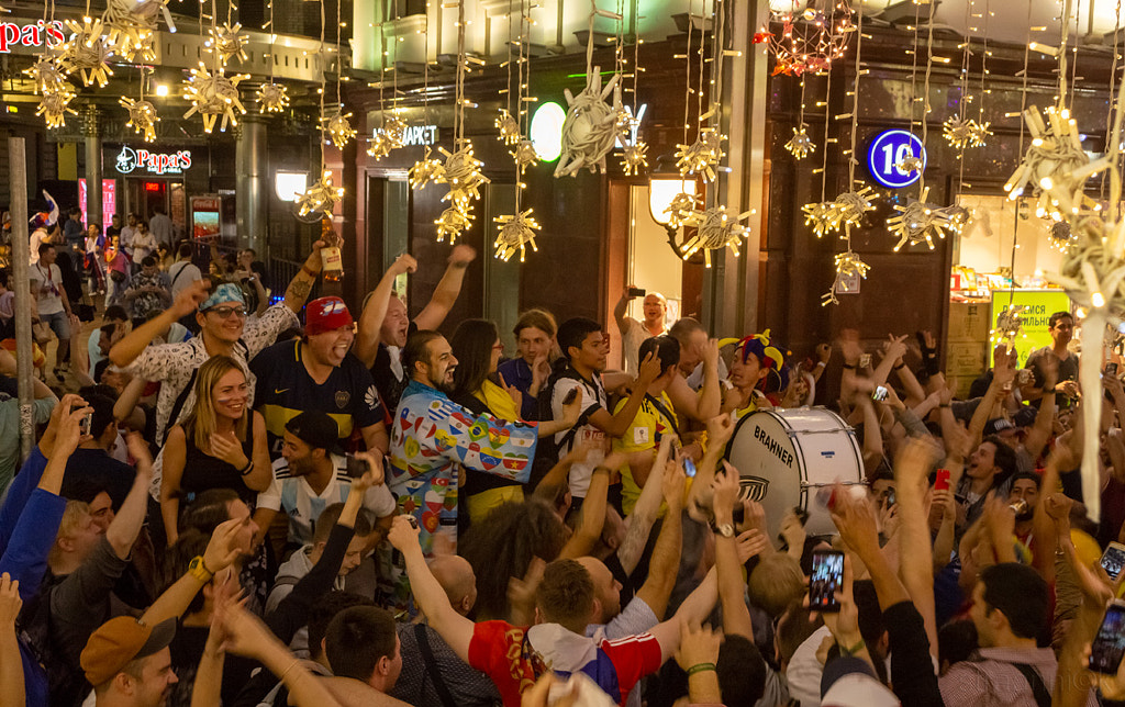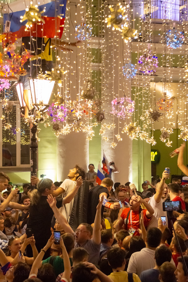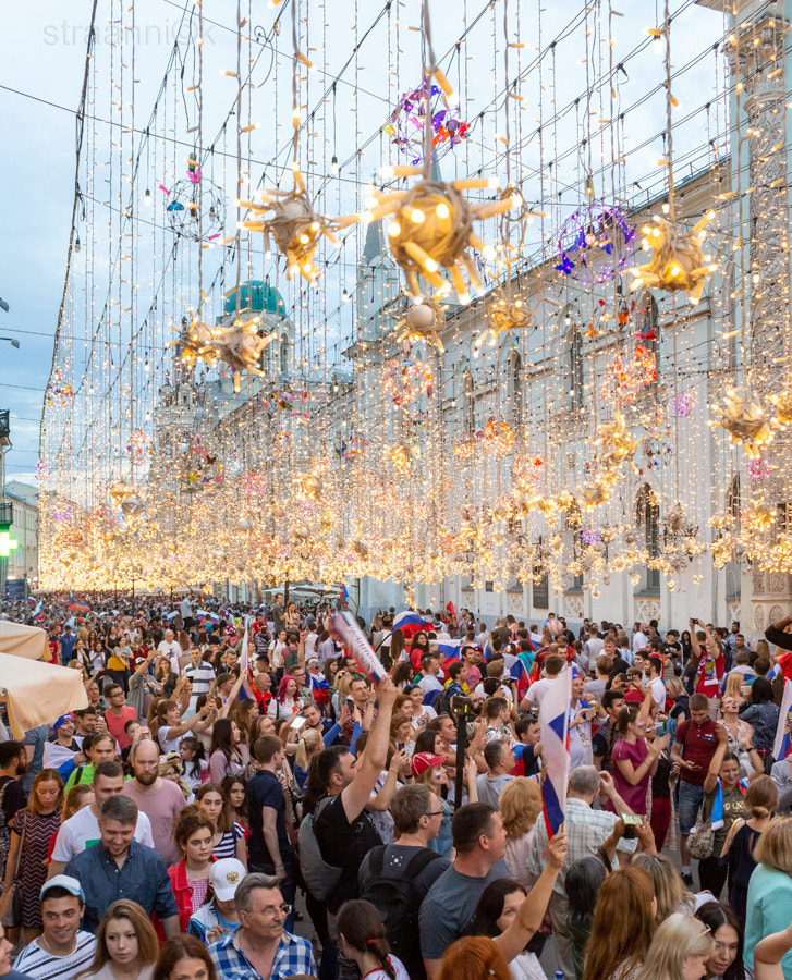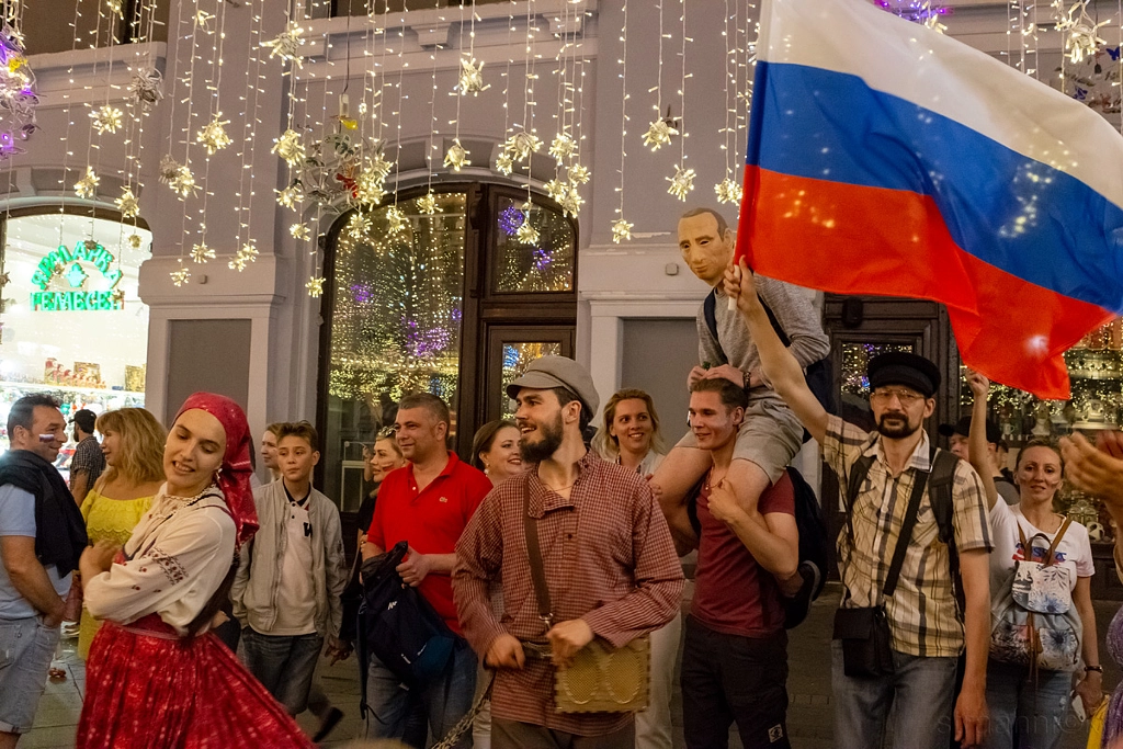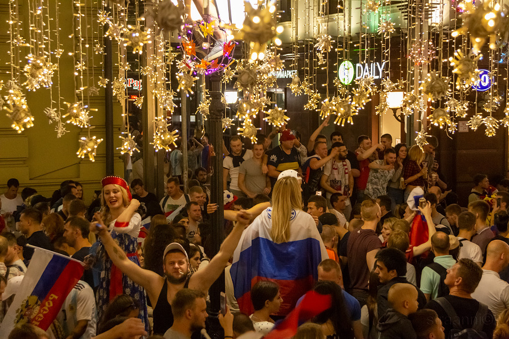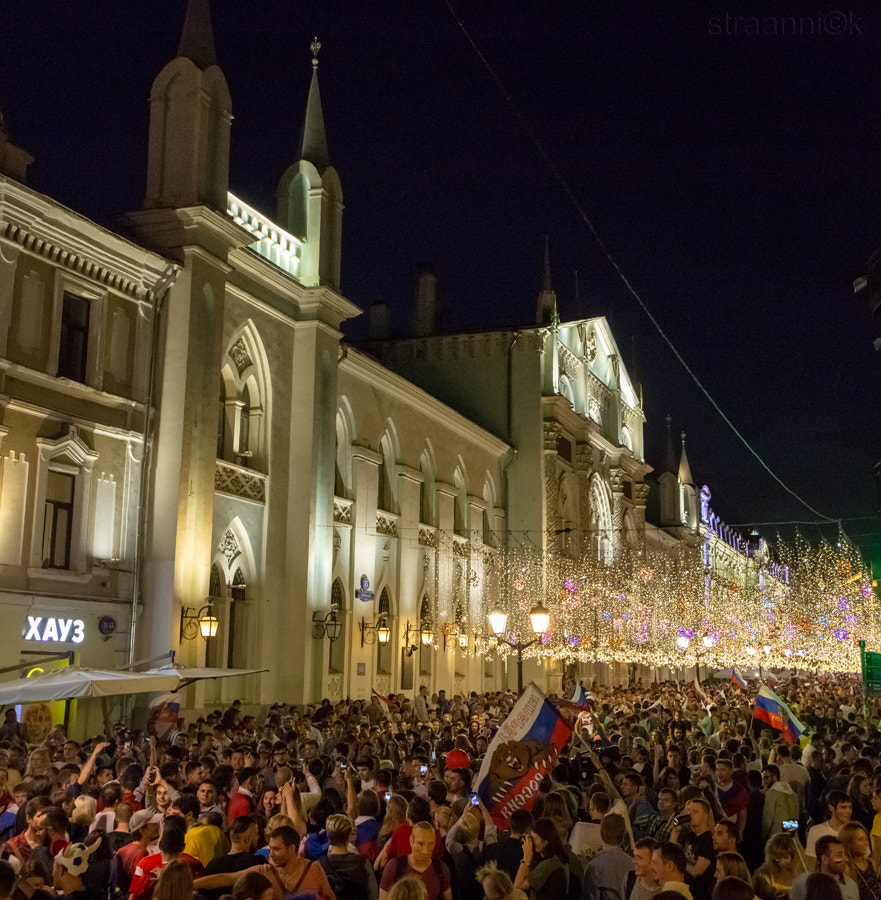 футбольные болельщики на ул.Пятницкая в Москве после победы России над Испанией 1.07.2018.