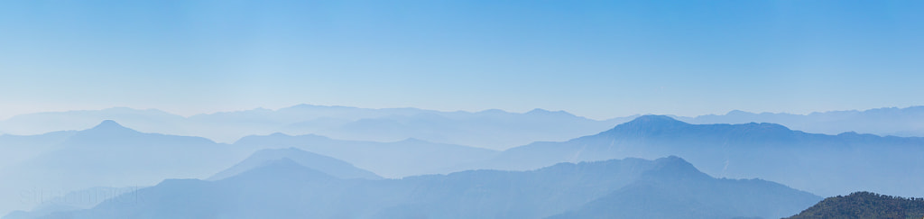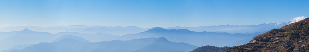 Здесь я впервые понял, что Николай Рерих не выдумывал цвета, а просто писал с натуры. Наш взгляд обращён почти точно на юг, поэтому Гималаи кажутся какими-то "ненастоящими" - обильно покрытые лесами холмы, всего-то высотой 3000-3500 м. Но за спиной на северо-западе в 70 км Канченджанга и другие восьми- и семитысячники. На панораме я оставил справа заселённый склон, потому что иначе взгляду не за что будет зацепиться. Сам же я предпочитаю другой вид, где нет ничего "лишнего", глядя на который тонешь в этой дымке и этих горах, и думаешь о чём-то личном. А при воспоминаниях я сознательно приглушаю эпизоды с бытовой суетой, включая и сам процесс съёмки, превращая такие поездки в миф моей жизни. Может это и неправильно, но сейчас я в этом, по-видимому, нуждаюсь.