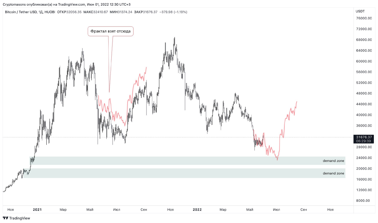 На скриншоте еще один потенциально рабочий фрактал, он взят за период аккумуляции (20 Мая 2021 - 20 Июля 2021 года).
