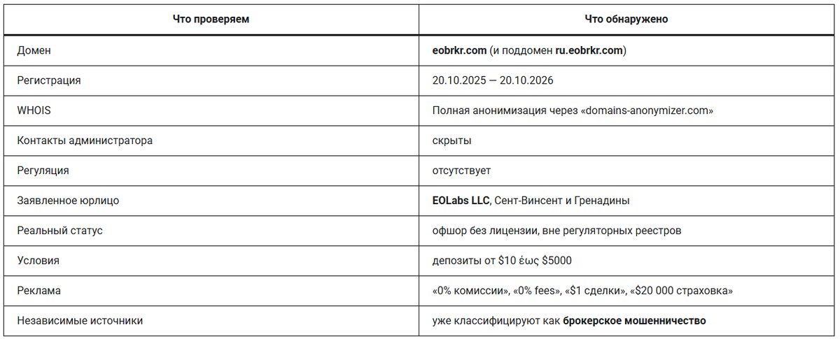 eobrkr.com — офшорное юрлицо и отсутствие регуляции