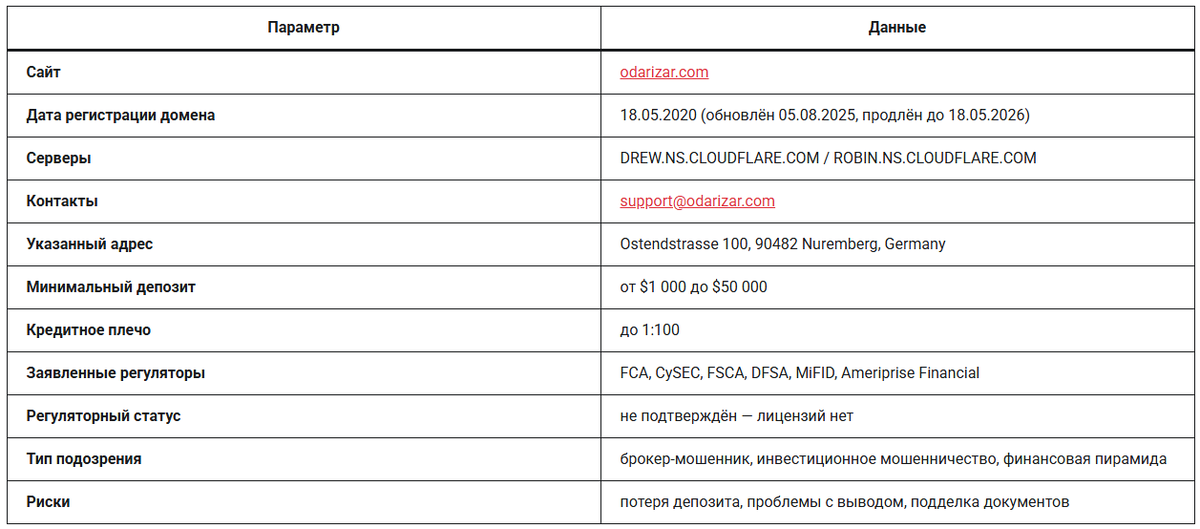 📍 Фактического присутствия Odarizar в Германии не обнаружено.