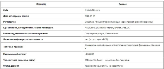 📌 1. Официальная таблица данных о FinDigitalLtd.com