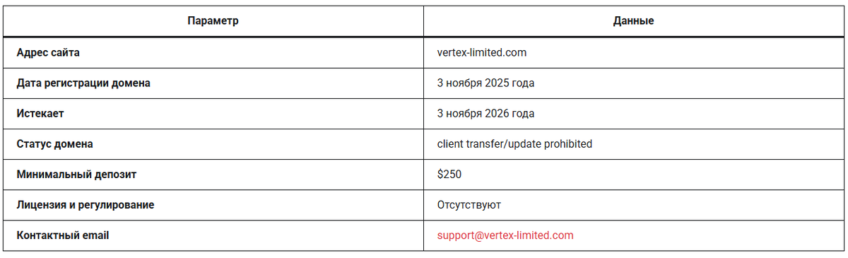Домен vertex-limited.com был зарегистрирован 3 ноября 2025 года и обещает инвесторам гарантированную прибыль, но на самом деле этот сайт не имеет лицензии и не регулируется. Как это возможно? Для реального брокера регистрация домена всего на год и скрытые данные о владельце — это непростительно.