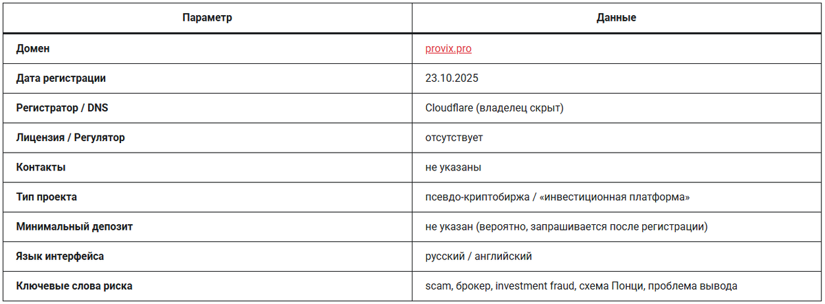 Все признаки говорят о том, что Provix.pro — не криптобиржа и не брокер, а мошеннический проект, созданный для краткосрочного сбора депозитов.