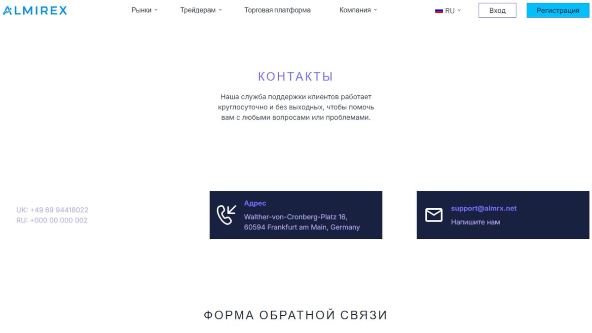 На сайте указаны два телефона, email и адрес офиса во Франкфурте.