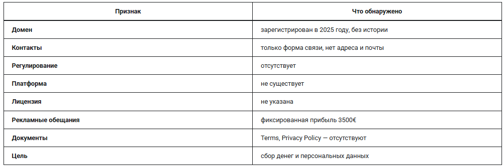 «Когда вам обещают 3500 евро прибыли при вложении 250 — вы должны понимать: это не инвестиция, а обман. Ни один брокер не гарантирует доходность, а отсутствие контактов и адреса делает возврат денег невозможным.»