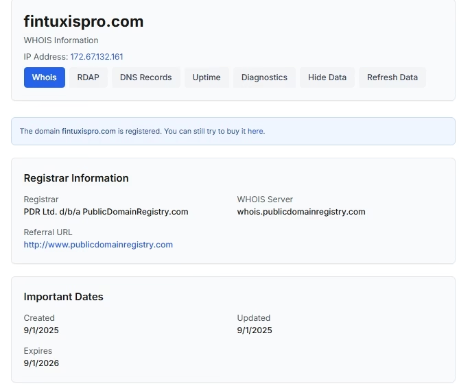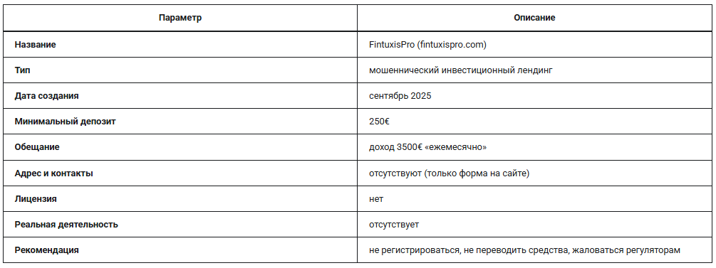 FintuxisPro (fintuxispro.com) — типичный сайт-однодневка, который выдаёт себя за брокера или инвестиционную платформу.
