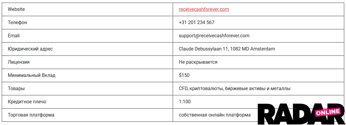 ReceiveCashForever — это брокер, работающий без лицензии FCA, и с непрозрачной схемой взаимодействия с клиентами. Несмотря на попытки выставить себя заслуживающей доверия организацией, при более детальном изучении выясняется, что компания просто выманивает деньги. Такой обман — серьезный признак ненадежности и небезопасности брокера.