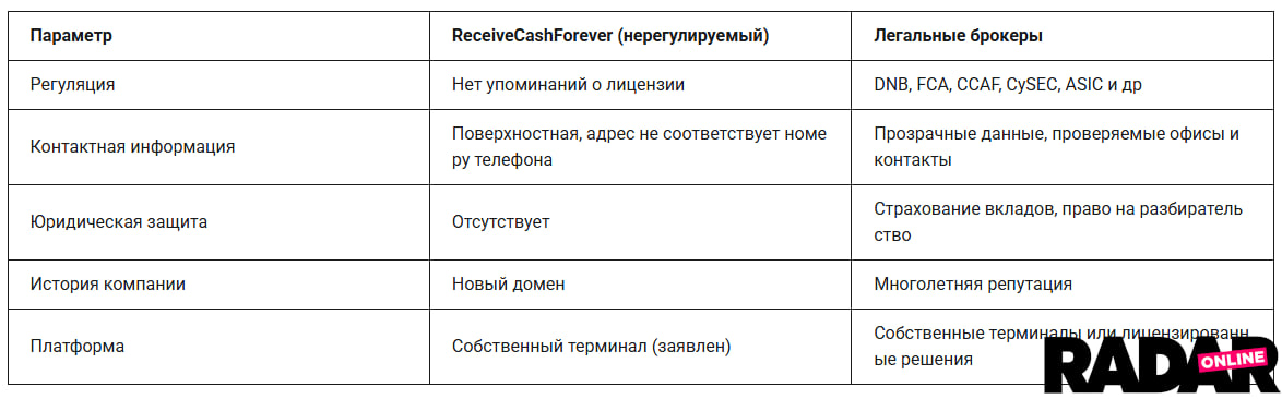 ПараметрReceiveCashForever (нерегулируемый)Легальные брокерыРегуляцияНет упоминаний о лицензииDNB, FCA, CCAF, CySEC, ASIC и дрКонтактная информацияПоверхностная, адрес не соответствует номеру телефонаПрозрачные данные, проверяемые офисы и контактыЮридическая защитаОтсутствуетСтрахование вкладов, право на разбирательствоИстория компанииНовый доменМноголетняя репутацияПлатформаСобственный терминал (заявлен)Собственные терминалы или лицензированные решения