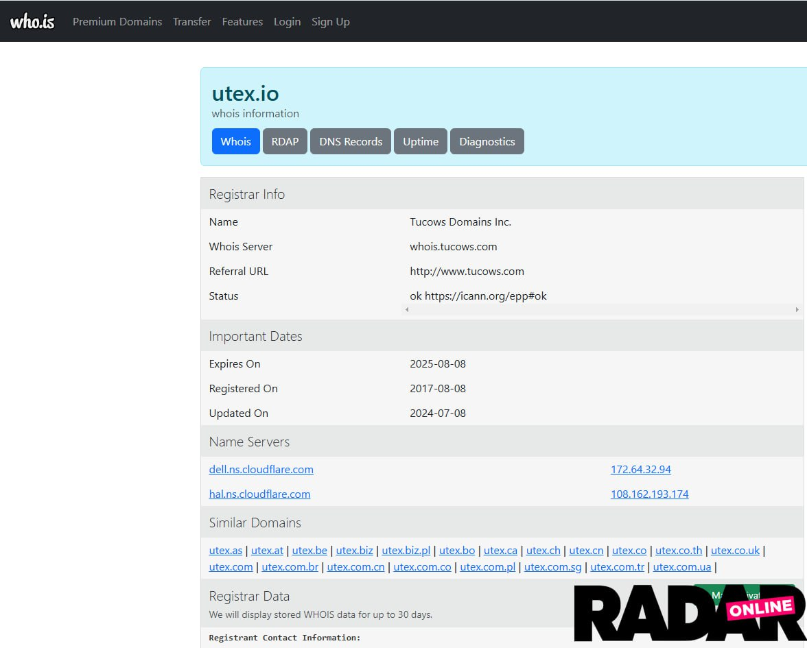 Но даже если на этом этапе вы ещё не насторожились, дальше будет хуже. Проверка домена показала, что сайт utex.io был зарегистрирован всего несколько месяцев назад. То есть, этот «опытный брокер» с «многолетним опытом» на самом деле только что появился на свет. И это уже первый серьёзный звоночек.