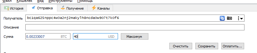 6.Переходим в Electrum во вкладку "Отправка", вводим адрес кошелька и сумму