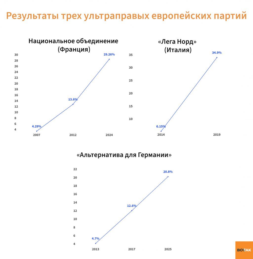 Итальянская «Лега Норд» сумела совершить прыжок с 6,15% в 2014 году до 34,9% в 2019-м. «Альтернатива для Германии» (АдГ) начала гонку за парламентские кресла в 2013 году, набрав 4,7% и не преодолев пятипроцентный барьер на пути в Бундестаг, а в 2017 году уверенно прошла в парламент (12,6%). В 2025 году АдГ получила 20,8% голосов (второе место), опередив даже правящую на тот момент старейшую германскую политическую силу, социал-демократов.