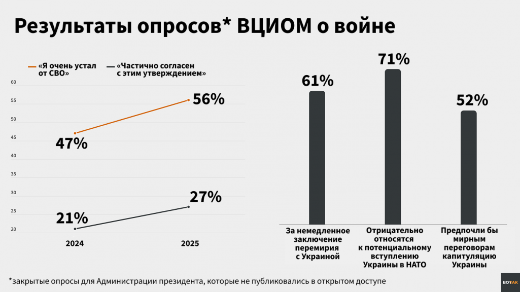 Отвечая на вопросы о войне, вариант «я очень устал от СВО» в 2024 году выбирали 47% опрошенных социологами, а 21% говорил, что частично согласен с этим утверждением. В 2025 году устали от войны уже 56% опрошенных (+9% к данным за прошлый год) и 27% (+6%) частично согласны с этим. То есть в Администрации президента отдают себе отчет в том, что война непопулярна в общей сложности у 83% россиян.