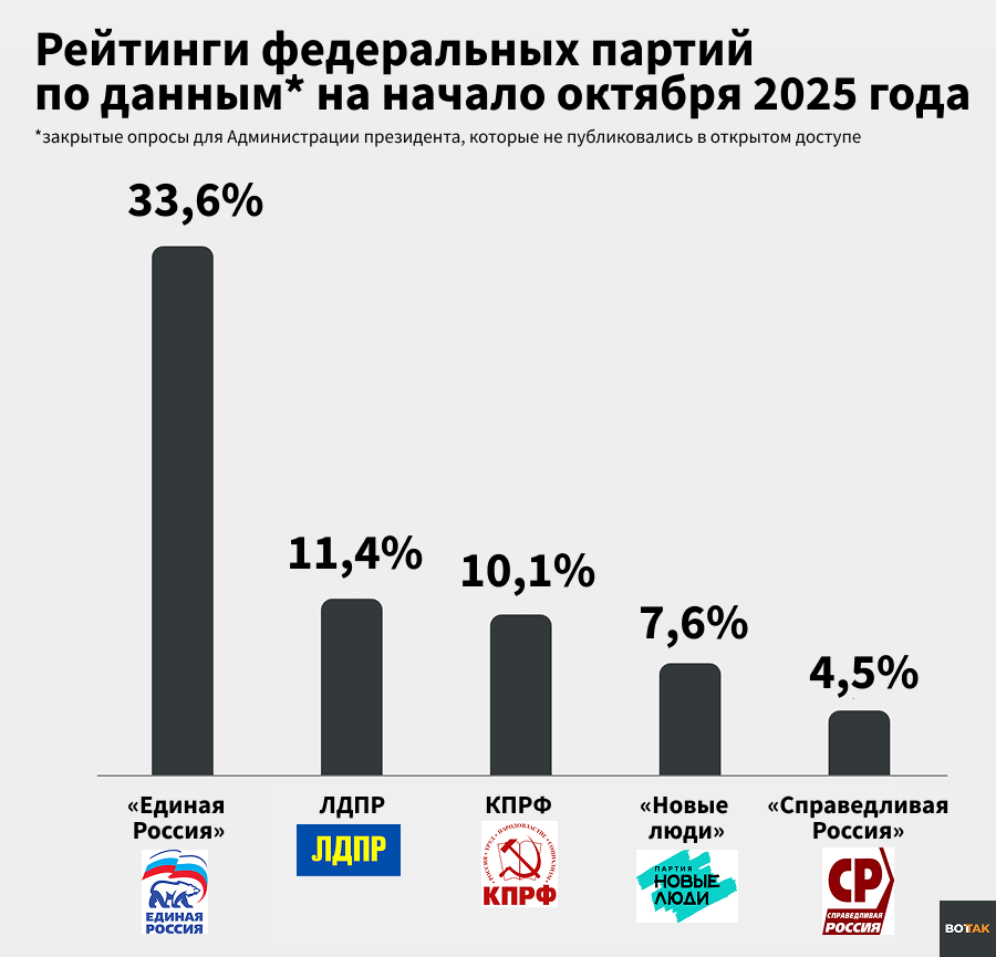 Авторы доклада знакомят региональных чиновников с актуальными рейтингами федеральных партий. По данным на начало октября 2025 года, «Единая Россия» популярна среди 33,6% опрошенных россиян. К сентябрю 2026 года планируется поднять этот рейтинг до 60%.