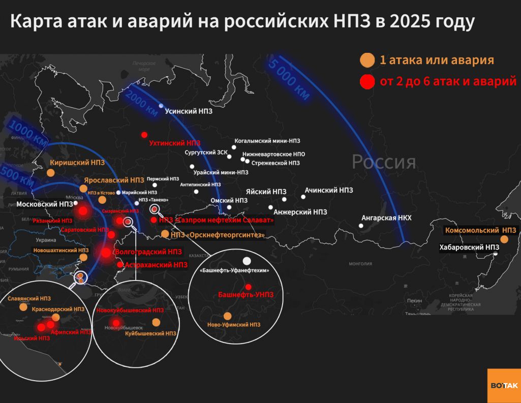 Более половины российских НПЗ в 2025 году пострадали от атак и аварий — карта