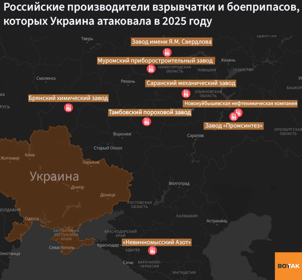 Кроме трех указанных выше предприятий в 2025 году прилетевшие с территории Украины дроны атаковали еще как минимум три российских завода, производящих взрывчатку и боеприпасы.