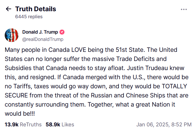 Еще до начала своего нового срока, президент США Дональд Трамп сделал ряд интересных заявлений. Эти заявления содержали довольно воинственные высказывания о присоединении Гренландии к США, [1] а в своей соцсети президент намекнул, что хотел бы видеть Канаду 51-м штатом Америки.