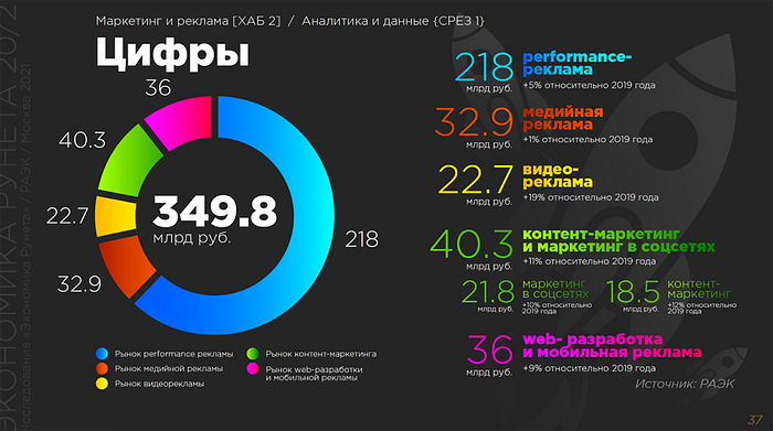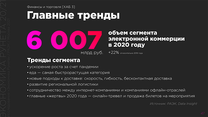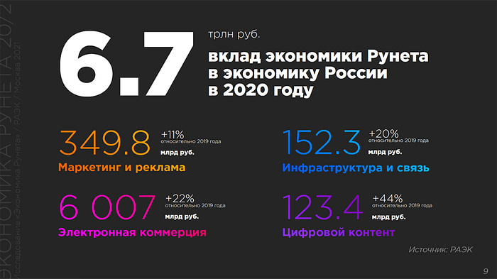 - Динамика роста экономики Рунета не менее важна, чем объем этого сегмента экономики (РАЭК посчитала: рост +22%, а объем — 6,7 трлн рублей по итогам 2020).