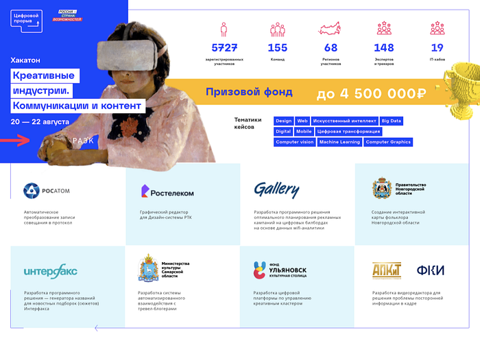 - Цифровой прорыв (онлайн: вся Россия, плюс ОФФЛАЙН: 19 хабов в разных городах): хакатон “Креативные индустрии. Коммуникации и контент”