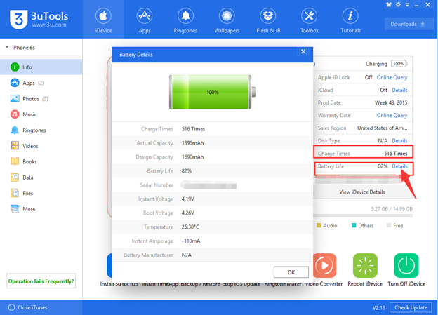 5. Battery Life — остаточная емкость аккумулятора устройства. Если нажать на «Details», то можно узнать детальную информацию о состоянии батареи