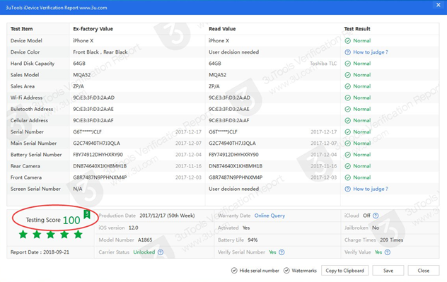 Откроется подробный отчет об устройстве. Если в телефоне никогда ничего не менялось, все запасные части оригинальные, то отчет будет такого типа:
