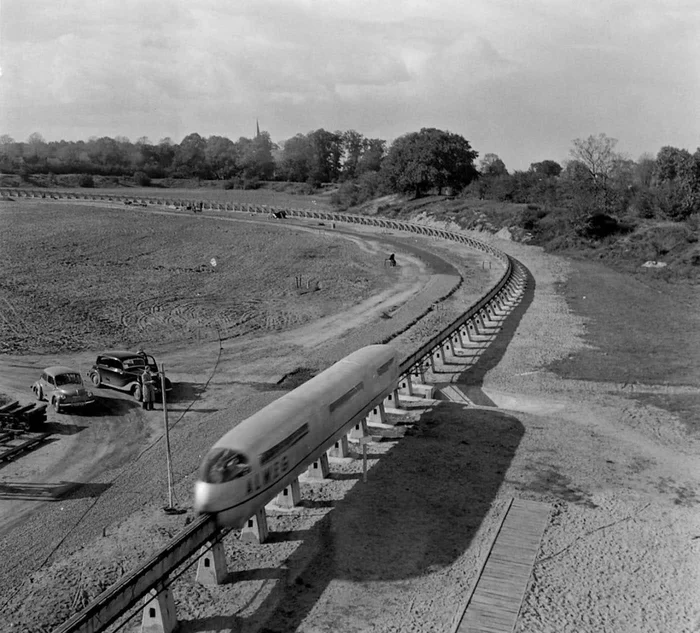 В своей концепции Alweg доктор Веннер-Грен представил монорельс, который бесшумно перемещается на резиновых шинах по гладкой бетонной балке, поддерживаемой бетонными колоннами.
