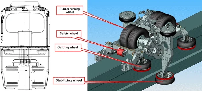 Чтобы предотвратить раскачивание поезда из стороны в сторону, ряд меньших шин зажимают балку, обеспечивая общую устойчивость, а также помогая направлять вагоны.