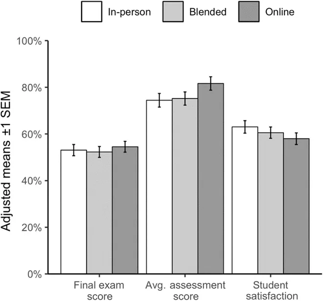 Что касается удовлетворенности самих студентов, то те, кто учился в онлайне — неожиданно — были менее довольны самим процессом. Как объясняют исследователи, это может быть связно с тем, что дистанционные занятия для нас все еще в новинку и мы не имеем должного опыта и навыков тайм-менеджмента. Однако онлайновые и смешанные курсы оказались гораздо дешевле обычных лекций: комбинированная форма обучения стоила на 15-19% меньше (для одного человека), а онлайн — на целых 79-81%.