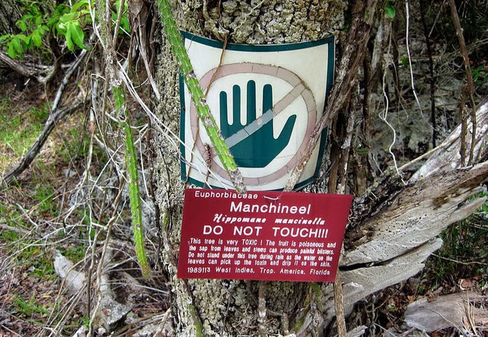 Манцинелла опасна всем. В ней ядовиты и кора, и плоды, и листья, и цветы, и даже роса, падающая с веток. В свое время коварное деревцо унесло не одну сотню жизней испанских конкистадоров, пиратов и простых европейских моряков, которые попытались утолить голод и жажду его ароматными сладкими плодами. Манцинелла продолжает убивать до сих пор, ведь не всегда она обнесена забором и предупреждающими об опасности табличками. Случается, страдают туристы, причем не только те, которые беспечно попробовали смертельные «яблоки», но и те, которые отдыхали в тени раскидистой кроны или пережидали под ней дождь.