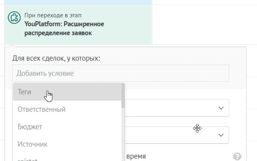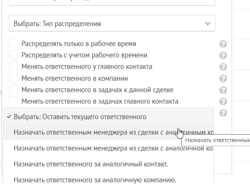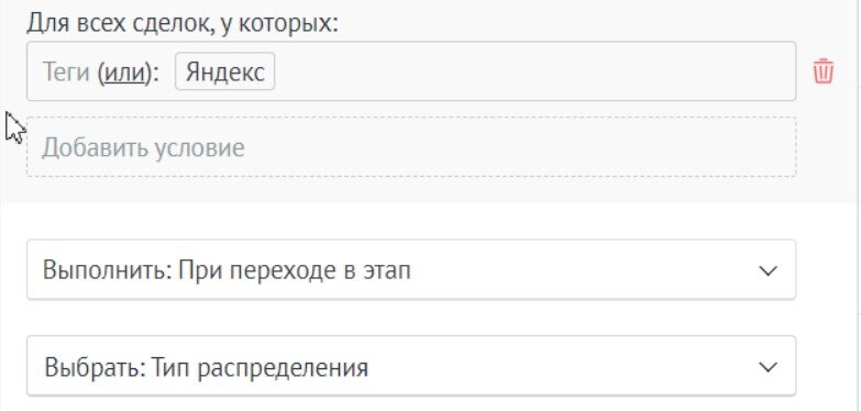 Так же можно распределять сделки в зависимости от какого-нибудь условия – к примеру все лиды, которые приходят с сайта по рекламе с Яндекса распределялись между Петром и Васечкиным, а с Авито – Григорию и Ростиславу.