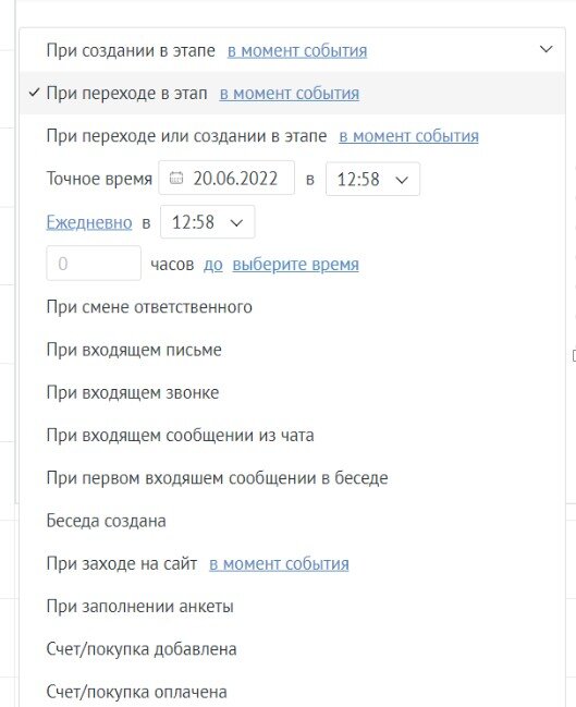 А, ну кароче говоря это значит, что сделки будут автоматически распределяться между менеджерами при попадании на этап или создании в нём или при любом из действий, которое так же можно в настройках триггера выбрать: