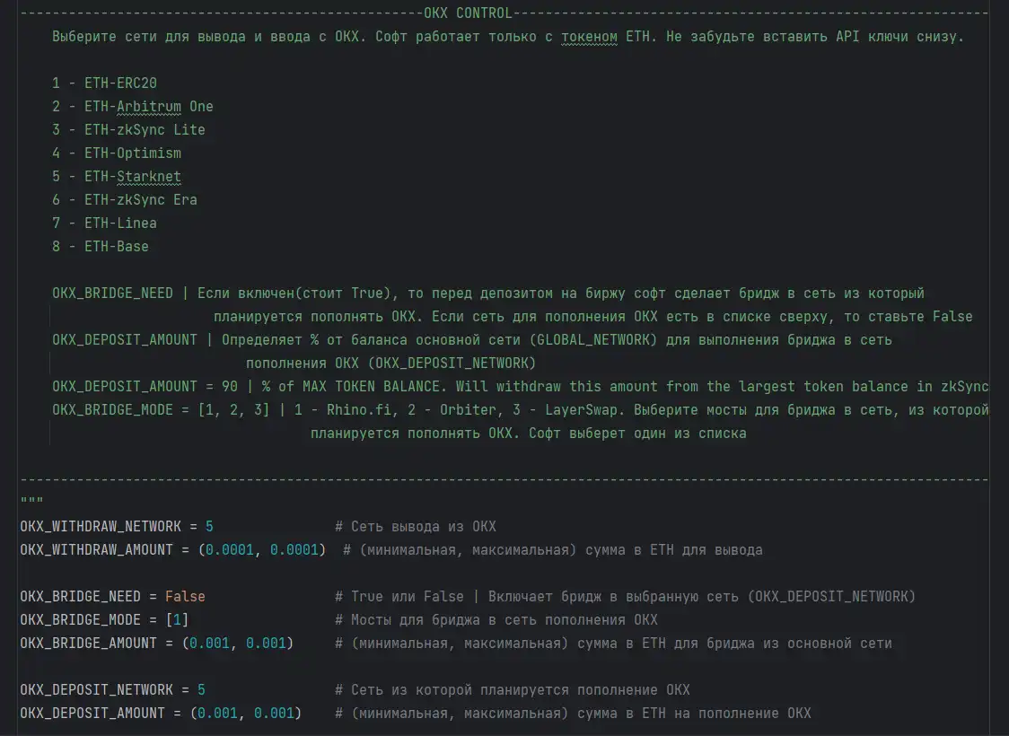 Для вывода средств на биржу, вам необходимо продумать план, так как не все L2 сети поддерживаются для пополнения OKX. Также вам необходимо заполнить данные в таблице под столбцом "OKX address" и сгенерировать файл зависимости ваших кошельков к адресам OKX. Делается это для того, чтобы вы могли проверить куда софт будет депать ваши средства и убедиться, что пересечений нету.Например вам нужно пополнить OKX, но ваши деньги находятся в сети Base. Вот поэтапная инструкция:Для осуществления вашего плана, сначала необходимо сделать бридж в выбранную сеть, которая поддерживается OKX (OKX_DEPOSIT_NETWORK). Если средства уже в этой сети, то выключите эту функцию (OKX_BRIDGE_NEED)Далее, вы должны выбрать какие мосты будут участвовать в этом процессе (OKX_BRIDGE_MODE), софт выберет один случайный.Затем, вам необходимо указать % от баланса, который вы хотите забриджить в сеть депозита OKX (OKX_BRIDGE_AMOUNT).Указать сумму депозита из сети, в которую вы забриджили ваш баланс (OKX_DEPOSIT_AMOUNT)