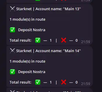 При TELEGRAM_NOTIFICATIONS = True, софт будет отправлять уведомления в Telegram, с сводной информацией об аккаунте(название аккаунта, маршрут, блокчейн, итоговый результат)(пример) Уведомление об успешной отработке 2 аккаунтов: