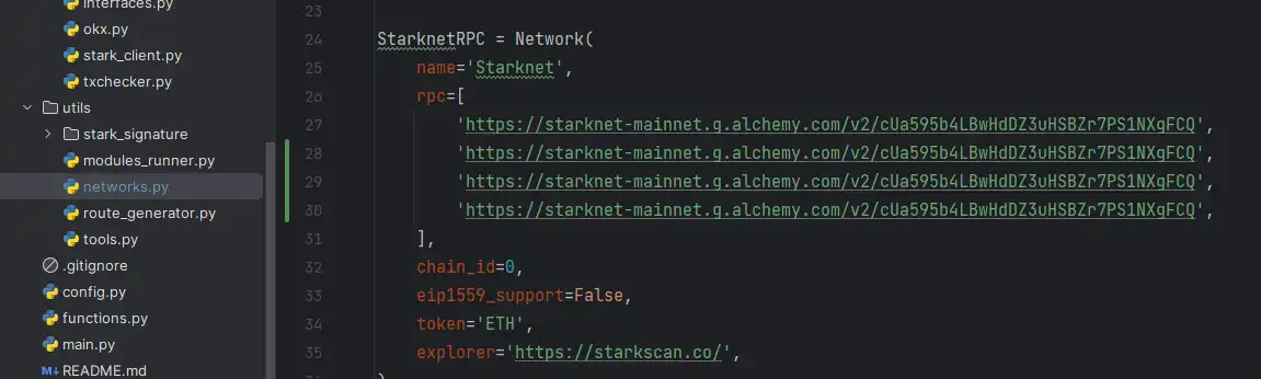 Для работы со Starknet вам необходимо создать свои приватные RPC. Я советую делать это на alchemy.com, так как они дают 5 бесплатных RPC, с очень хорошими лимитами. По умолчанию - стоит моя RPC, желательно ее от туда убрать и поставить свои)Остальные сети также поддерживают настройку с приватными RPC, но по умолчанию они работают с публичными RPC и их можно не менять.Для изменения этих настроек, вам необходимо пройти в файл: utils/networks.pyИ для каждой RPC в значении rpc указать свои ссылки на подключения к ним(через запятую и в кавычках), вот пример как это сделать на StarknetRPC.Настройка RPС в софте: