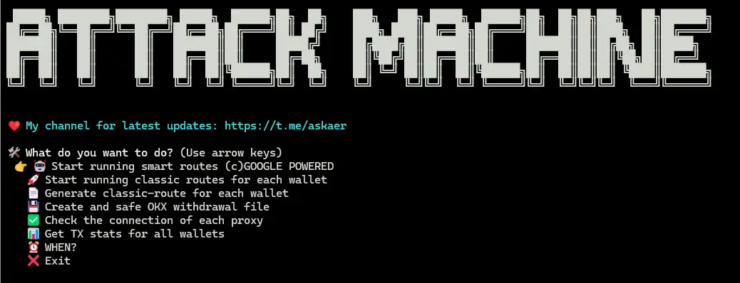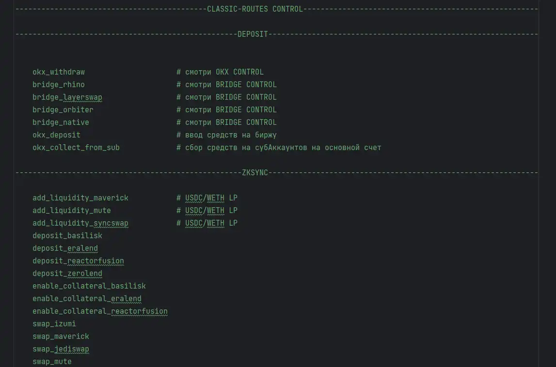 Запуск работы софта по Google таблице. Эта тачка сама будет брать информацию из таблицы и создавать для каждого аккаунта свой уникальный маршрут прогона.Запуск работы софта по классическим роутам. Сначала необходимо создать маршрут в настройках. Далее сгенерировать его с помощью следующей функции.Генерация уникального маршрута для каждого аккаунта. Софт сгенерирует маршрут исходя из ваших настроек в файле settings.Создание файла привязки ваших кошельков к адресам OKX. Эта функция позволит проверить все созданные зависимости для вывода средств во избежания проблем с пересечением аккаунтов.Проверка всех прокси на работоспособность. В моменте проверит 100+ прокси.Сбор статистики для всех кошельков. Также быстро это делает, но необходимы прокси для корректной работы. *05.12.2023 работает только для zkSyncWHEN? без комментариев.Выход из консоли.