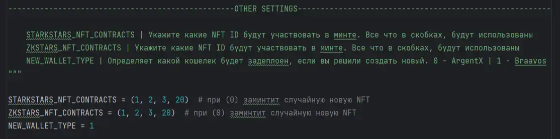 Сюда будут собраны все дополнительные настройки для софта. На 05.12.2023 тут находятся настройки STARKSTARS_NFT_CONTRACTS и ZKSTARS_NFT_CONTRACTS, которые позволяют указать какой контракт необходимо заминтить в приложении zkStars или StarkStars. Если указать 0, то софт заминтит случайную NFTNEW_WALLET_TYPE нужна для деплоя новых кошельков в Starknet. Полезно, если вы решите сделать пополнение с OKX, а потом сразу деплой. Если вы создали кошельки ArgentX укажите 0, Braavos = 1