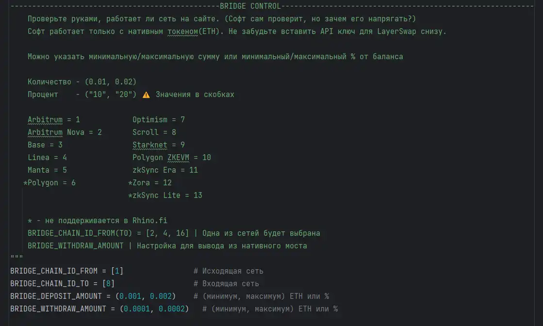- Самостоятельно проверьте рабочие направления для бриджей на сайте моста и укажите нужные исходящие сети (BRIDGE_CHAIN_ID_FROM) и входящие сети (BRIDGE_CHAIN_ID_TO), софт выберет по одной из каждой настройки.