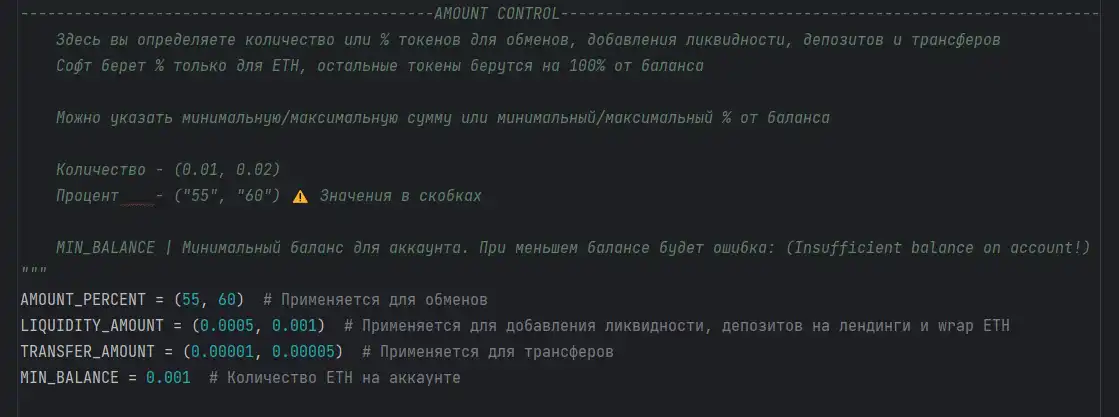 Настройка количества токенов может определяться либо количественно(0.01, 0.02), либо в процентном соотношении к балансу на аккаунте ("20", "30"), кроме AMOUNT_PERCENT (его указывайте только в %)Все настройки применяются только к токену ETH, остальные токены выводятся или свапаются на 100% от баланса