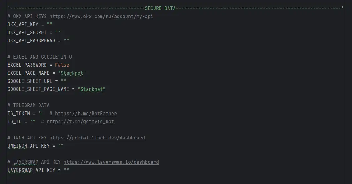 В файле settings вы сможете увидеть подробное описание каждой настройки в софте, но самые важные я опишу и здесь. В целом машина была спроектирована с максимальным комфортом для пользования и настроек осталось по минимуму.Для работы 1inch, LayerSwap, OKX, Telegram уведомлений, Google таблицы необходимо вставить API ключи. Не забудьте про них!