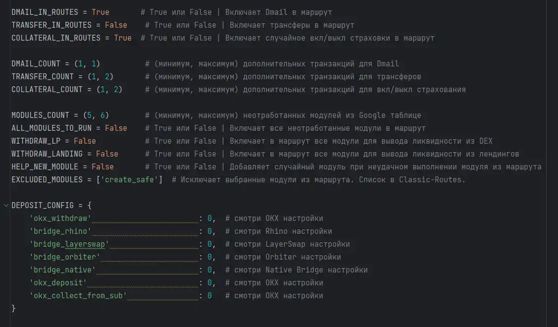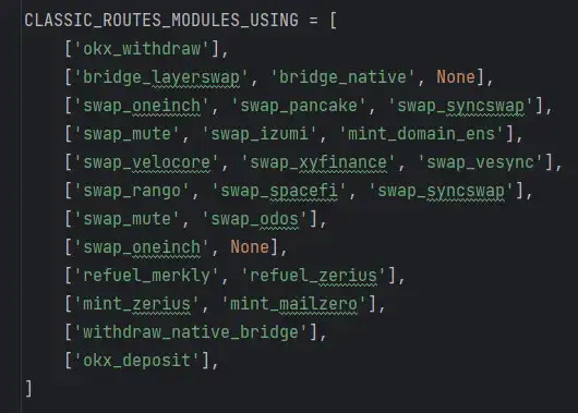 Обычные роуты для работы без Google таблицы. Вся суть заключается в создании одного сложного маршрута, по которому будут сгенерированы все остальные для всех аккаунтов. Ваша задача - это указать модули в квадратных скобках, через запятую. Все названия модулей вы сможете найти в этой настройке внутри софта.Для того, чтобы пропустить модуль в маршруте, вам необходимо указать None, как один из модулей. При выборе None, софт может пропустить все модули, указанные в списке, что позволит сделать маршрут уникальным. Чтобы увеличить вероятность пропуска списка модулей, укажите None несколько раз.Вот пример списка, с вероятность 50%, что софт пропустит его при генерации и 25% на каждый из модулей.[CODE=code][None, None, 'deposit_reactorfusion', 'deposit_zerolend'][/CODE]