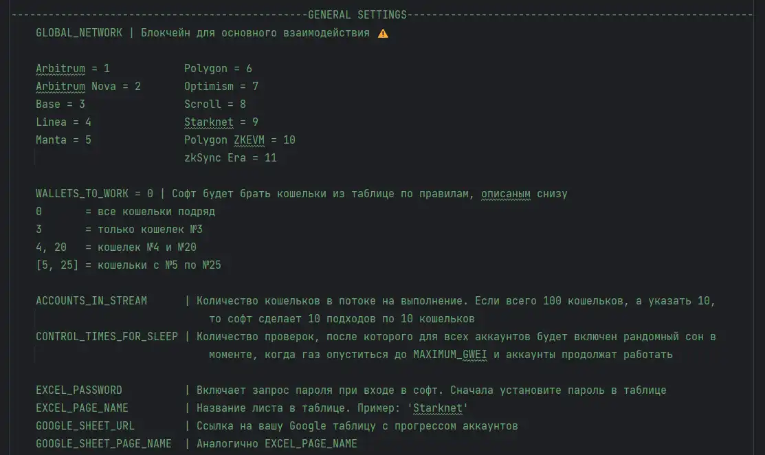 Настройка GLOBAL_NETWORK, позволяет выбрать главный блокчейн для работы софта. Выбрав Starknet, вам также необходимо указать лист в таблице Excel и Google, чтобы софт не пытался запускать аккаунты старка с помощью приватников EVM.Если вам нужен Omni-chain функционал, ставьте EVM сети.